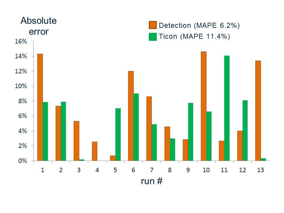 The accuracy of Ticon algorithm using consolidated input data available from local transportation departments is about the same as traditional proven detection technology can deliver.
