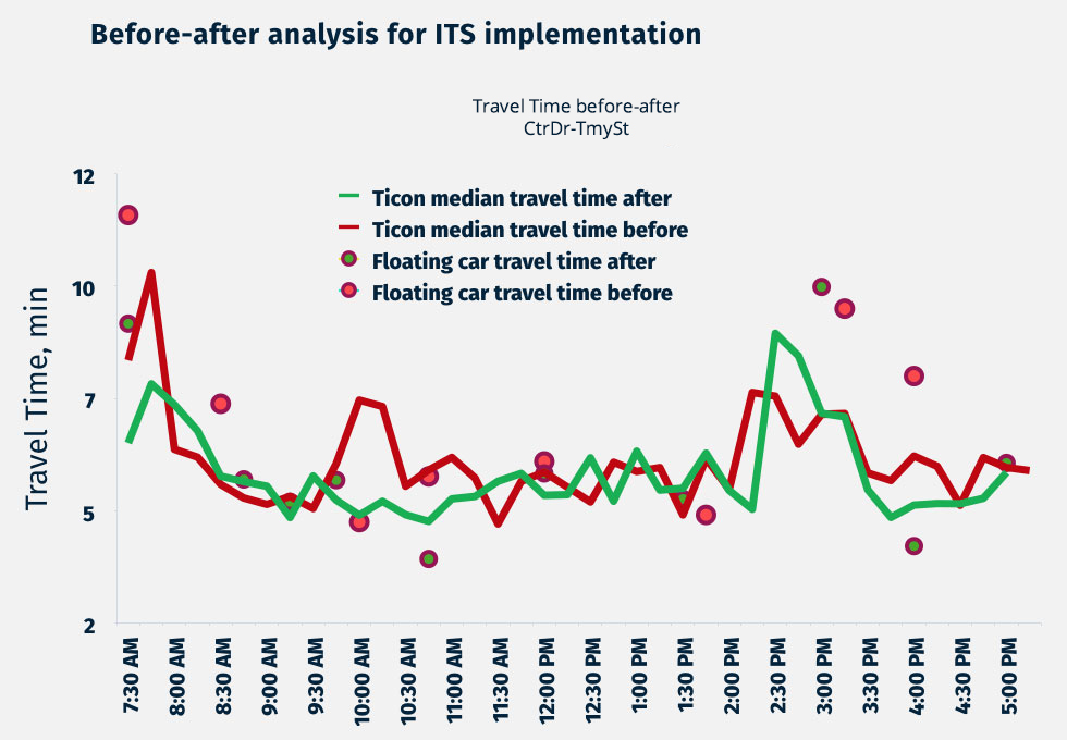 Total number of floating car runs – 76. Number of Ticon estimation - 192. Site: Fremont, CA [3]. Direct comparison of travel time measurements performed by floating cars with travel time estimations made by Ticon. Direct comparison of the ‘before-after’ benefits calculated from floating cars’ measurements and Ticon estimations.