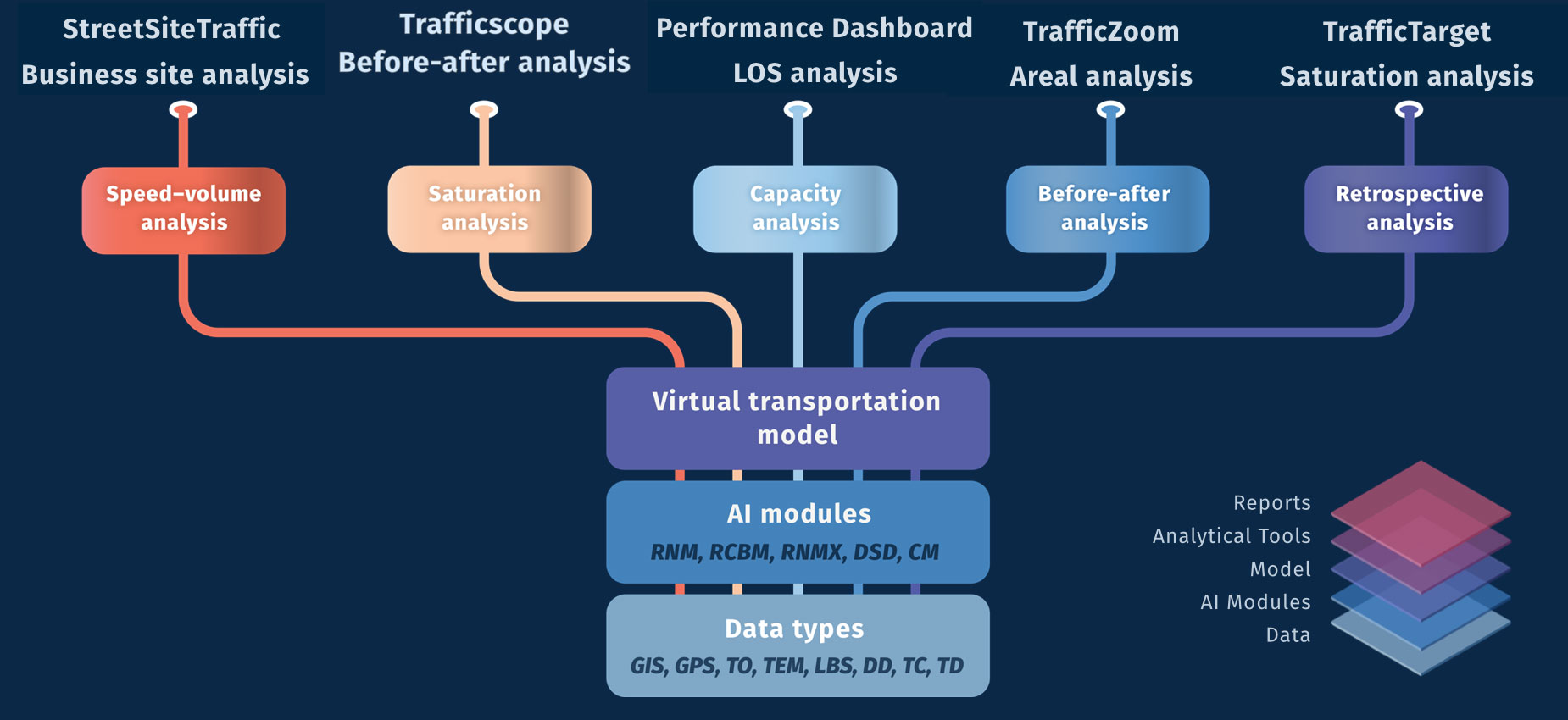 Analytical tools extract specific information from virtual transportation model to deliver traffic flow volume and traffic flow speed information, as well as specific metrics: traffic delay, travel time delay, saturation degree, LOS, etc.