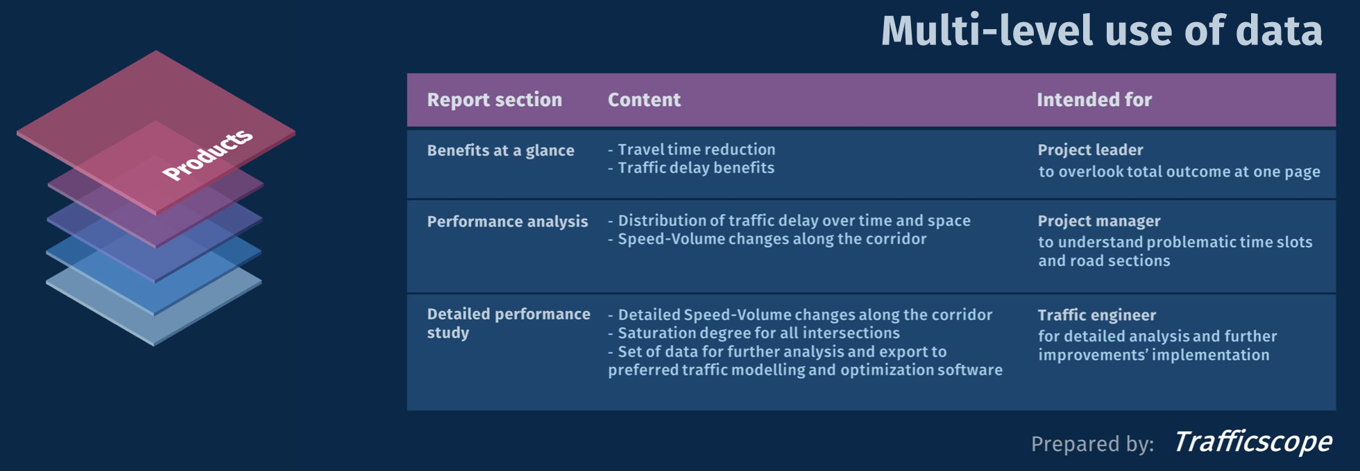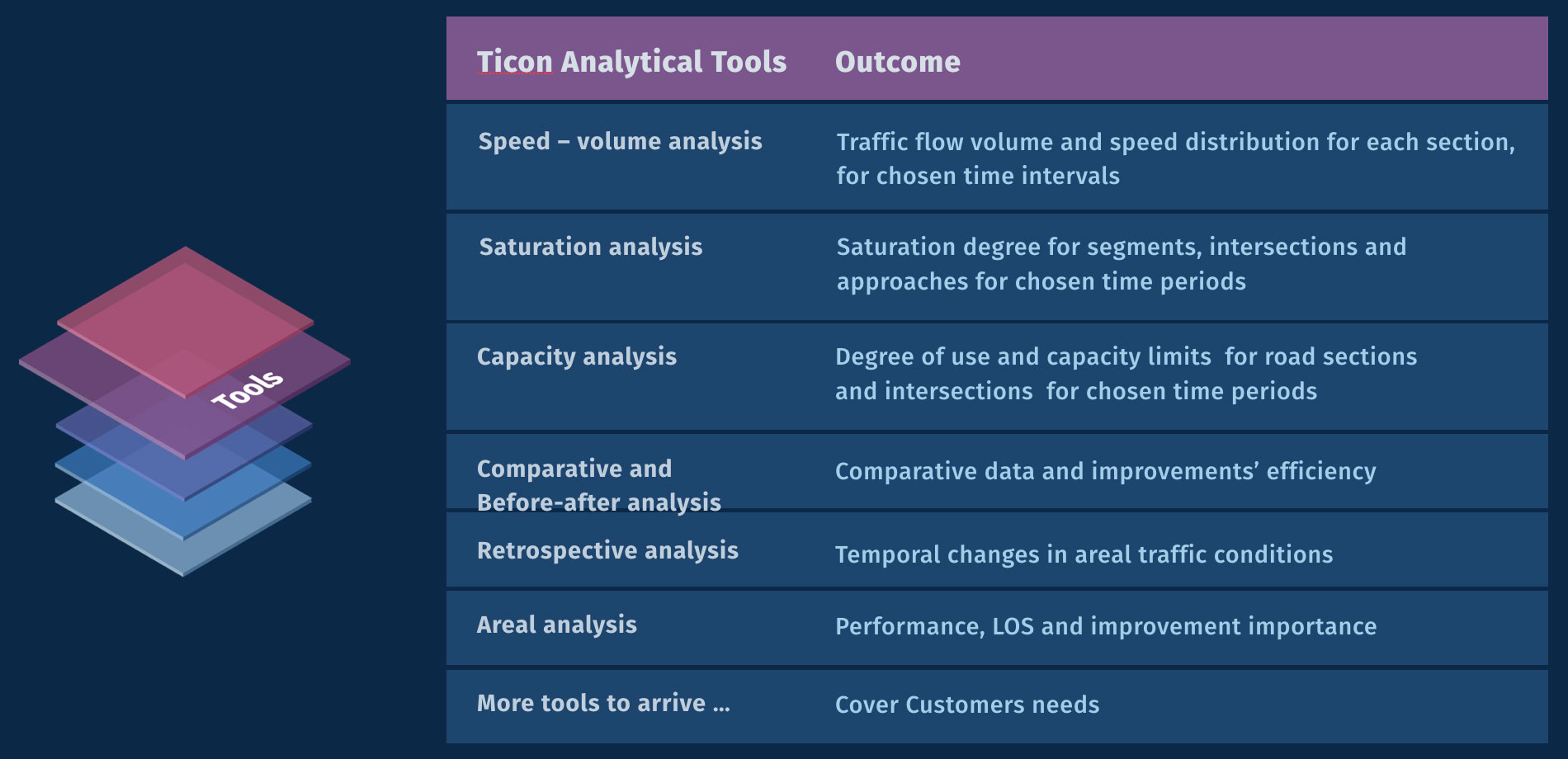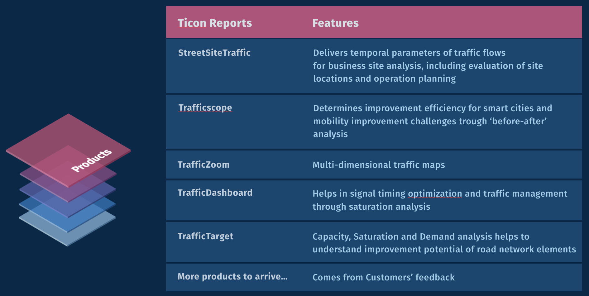 Ticon product – traffic maps, dashboard and customer oriented reports allow comprehensive areal analysis of traffic network. Reports provide the user with ready-made information for decision making, are generated based on simple formal requests, and require no special training, additional data processing or modeling.
